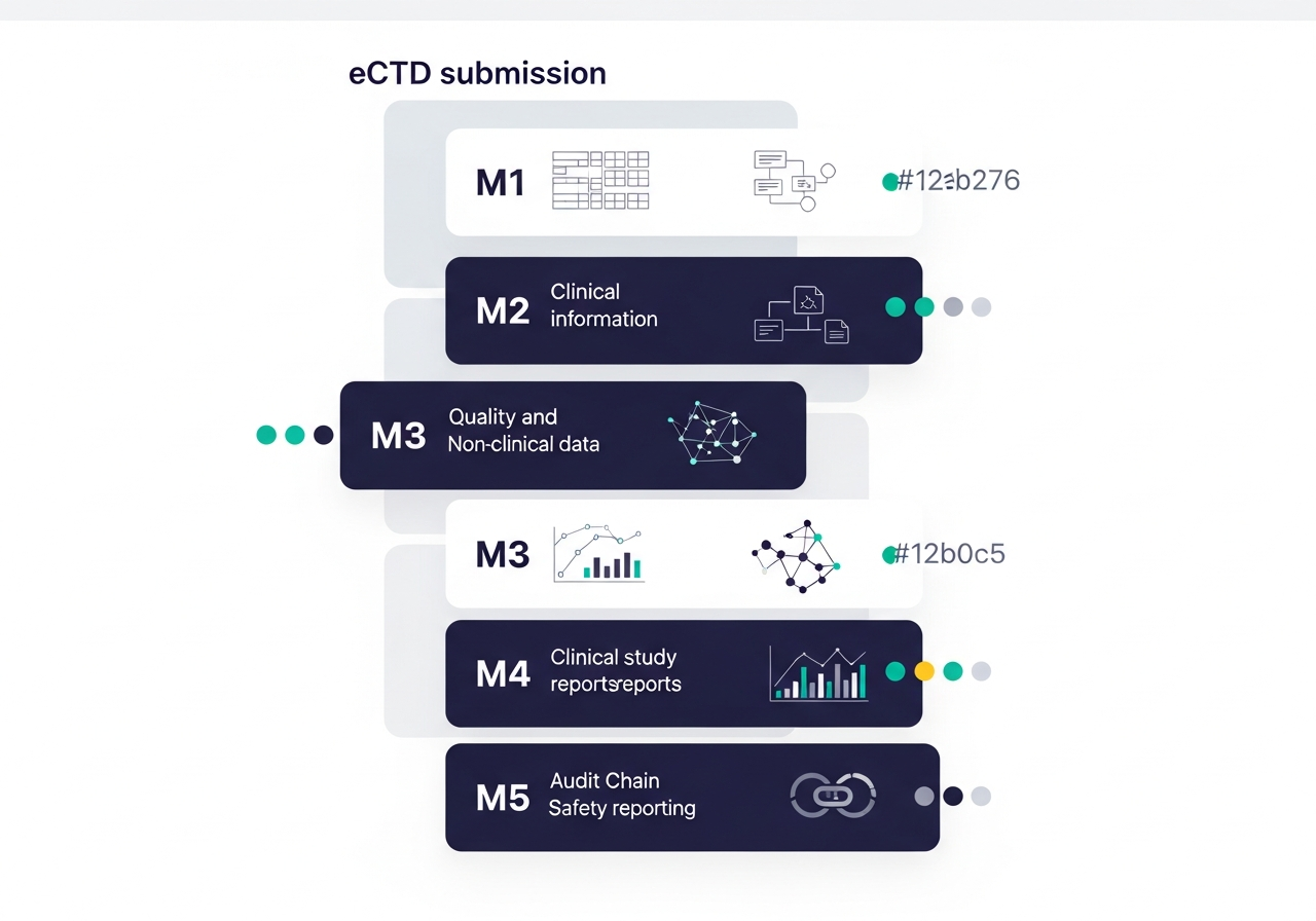 eCTD Module 1-5 structure, gap analysis, cross-reference QC, readiness dashboards for IND, NDA, MAA, variations.